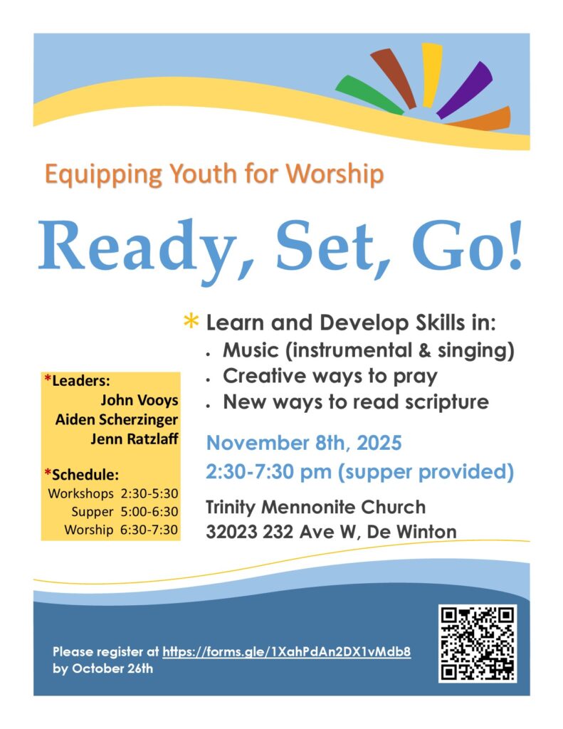 - Trinity youth are part of the “Youth with Foothills” program of Friday night activities and other events. Youth with Foothills is made up of youth from three churches (Trinity, Foothills Mennonite, and First Mennonite), and led by Aiden Scherzinger, Associate Pastor at Foothills. Events are typically held at one of the churches in, 6:30 – 9:00pm, most Friday nights. Details will be posted in our Trinity calendar, and parents may sign up for a weekly email from Aiden. If you have any questions, contact Pastor Terry: pastor@calgarytmc.ca