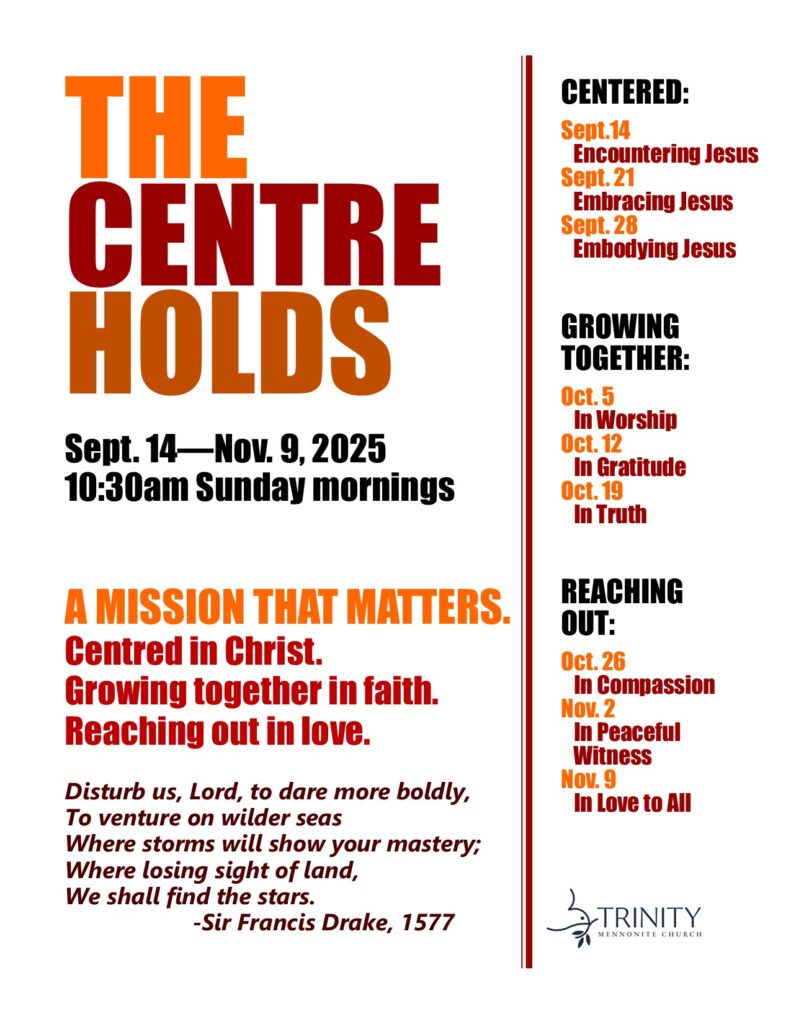 This class is recommended for those wishing to prepare for baptism, church membership, or for those simply wanting to learn more about the Christian way of life from an Anabaptist perspective. Every class will cover a key theme in the story of God as told in the Bible, and also point to ways our own lives connect with this story. The class is open to long-time believers and those who aren’t sure what they believe. Please contact the church office if you would like to attend: office@calgarytmc.ca